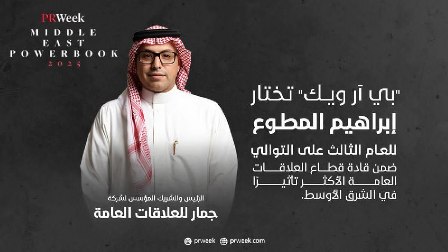 اختارت مجلة PRWeek العالمية المتخصصة في مجال العلاقات العامة والاتصال، إبراهيم المطوع، الرئيس والشريك المؤسس لشركة جمار للعلاقات العامة، ضمن قائمة قادة قطاع العلاقات العامة والاتصال الأكثر تأثيرًا في منطقة الشرق الأوسط لعام 2025، وهي السنة الثالثة على التوالي التي تُدرج فيها المجلة اسم المطوع في قائمتها السنوية، والتي تسلط الضوء على رواد القطاع في المنطقة الذين يشكلون مستقبل صناعة الاتصال.