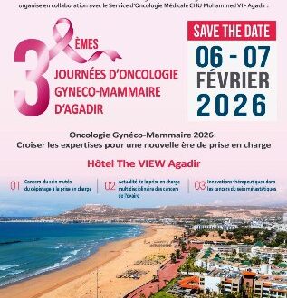 بتنسيق مع مصلحة الأنكولوجيا الطبية بالمركز الاستشفائي الجامعي محمد السادس بأكادير، تنظم “جمعية أخصائيي الأورام الطبية بأكادير”، الدورة الثالثة لأيام أكادير للأنكولوجيا النسائية الثديية،يومي 6 و7 فبراير 2026. (3è journées d’oncologie gynéco-mammaire d’Agadir) تحت شعار تجميع الخبرات من أجل عهد جديد في التكفّل بالعلاج“بمشاركة نخبة من الأخصائيين والخبراء في مجال الأنكولوجيا.