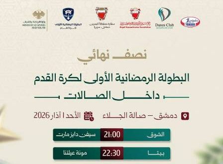 تتجه أنظار عشاق كرة القدم داخل الصالات مساء اليوم إلى صالة الجلاء في دمشق، حيث تُقام مواجهتا الدور نصف النهائي من البطولة الرمضانية الأولى لكرة القدم داخل الصالات، في أمسية كروية مرتقبة تنطلق عند الساعة التاسعة مساءً وسط أجواء حماسية منتظرة.