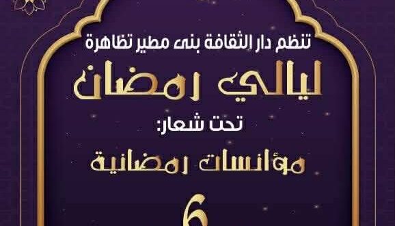 في اطار ليالي السهر والسمر الرمضانية لسنة 2026 وتحت شعار “مؤانسات رمضانية تنظم دار الثقافة بني مطير التي تشرف على ادارتها الاستاذة أمينة حسين فعاليات الدورة السادسة لتظاهرة” ليالي رمضان “وذلك من 8 الى 12 مارس الجاري ومن خلال مجموعة من السهرات الرمضانية الساحرة التي تجمع بين ثنائية سحر الطبيعة وسحر الفن والإبداع
