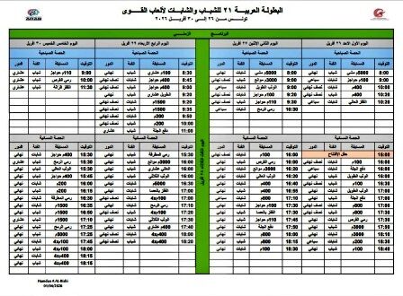 أصدر الاتحاد العربي لألعاب القوى البرنامج الزمني الرسمي للبطولة العربية الحادية والعشرين للشباب والشابات، المقررة في تونس من 25 إلى 30 أبريل الجاري، عقب اعتماده من قبل المندوب الفني واللجنة المنظمة، في خطوة تؤكد دخول التحضيرات مرحلتها النهائية تنظيمياً وفنياً.